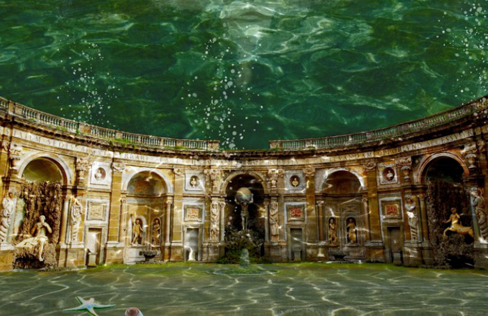 Il percorso espositivo prosegue lungo i viali del giardino e nelle serre, dove sono presentate fotografie che raffigurano alcuni luoghi celebri del patrimonio culturale italiano, reinterpretati dall’artista e immersi, attraverso la postproduzione, in una dimensione acquatica e straniante.
